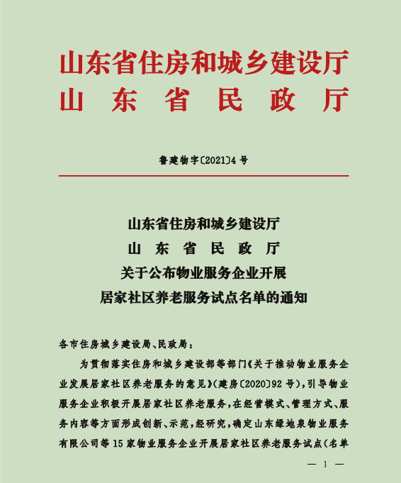 2021年9月6日,山東省住房和城鄉(xiāng)建設(shè)廳、山東省民政廳聯(lián)合公布了關(guān)于物業(yè)服務(wù)企業(yè)開(kāi)展居家社區(qū)養(yǎng)老服務(wù)試點(diǎn)名單,我公司在首批試點(diǎn)名單之列。 ......